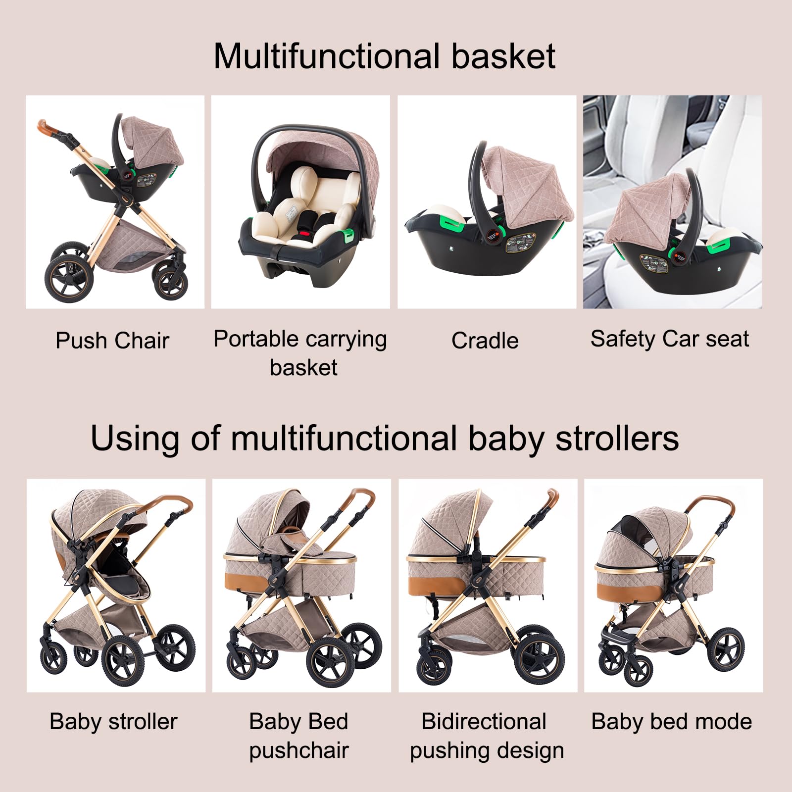 BEBBY 3-in-1 Kinderwagen KombiKinderwagen-Set 2-in-1 Buggy faltbar Luxus Hochlandschaft Neugeborenes Tragbarer Zusammenklappbarer Kinderwagen Travel System (Blackgold, H2)