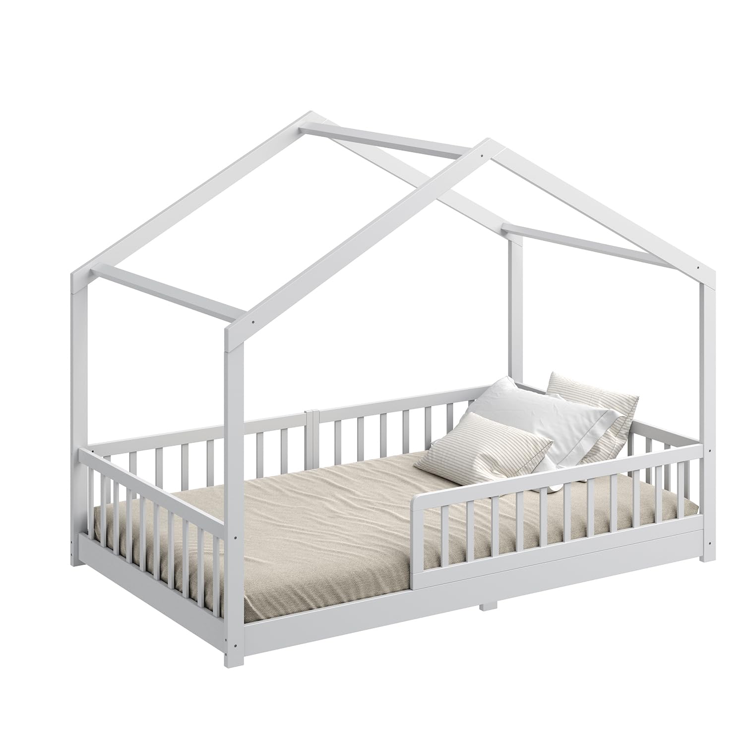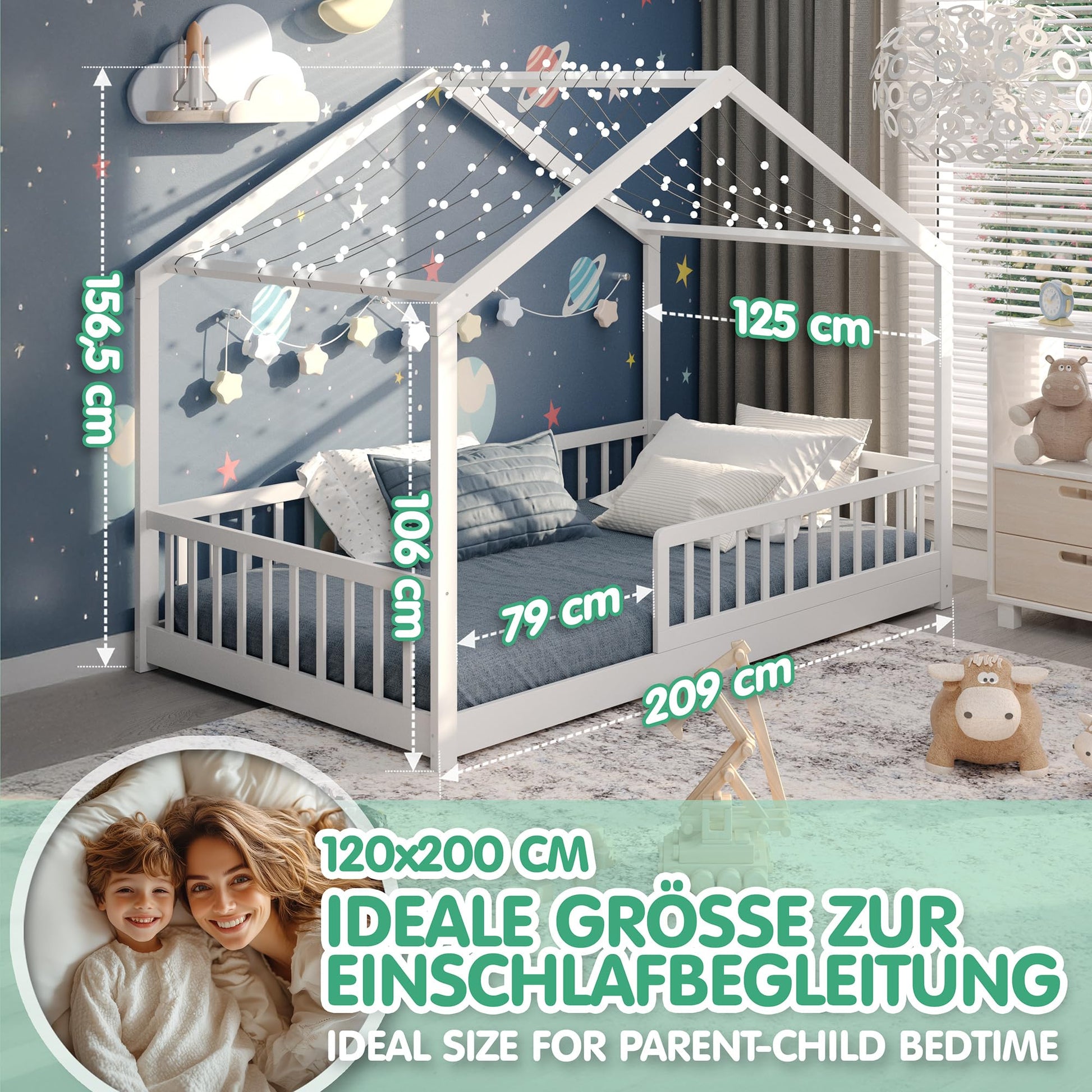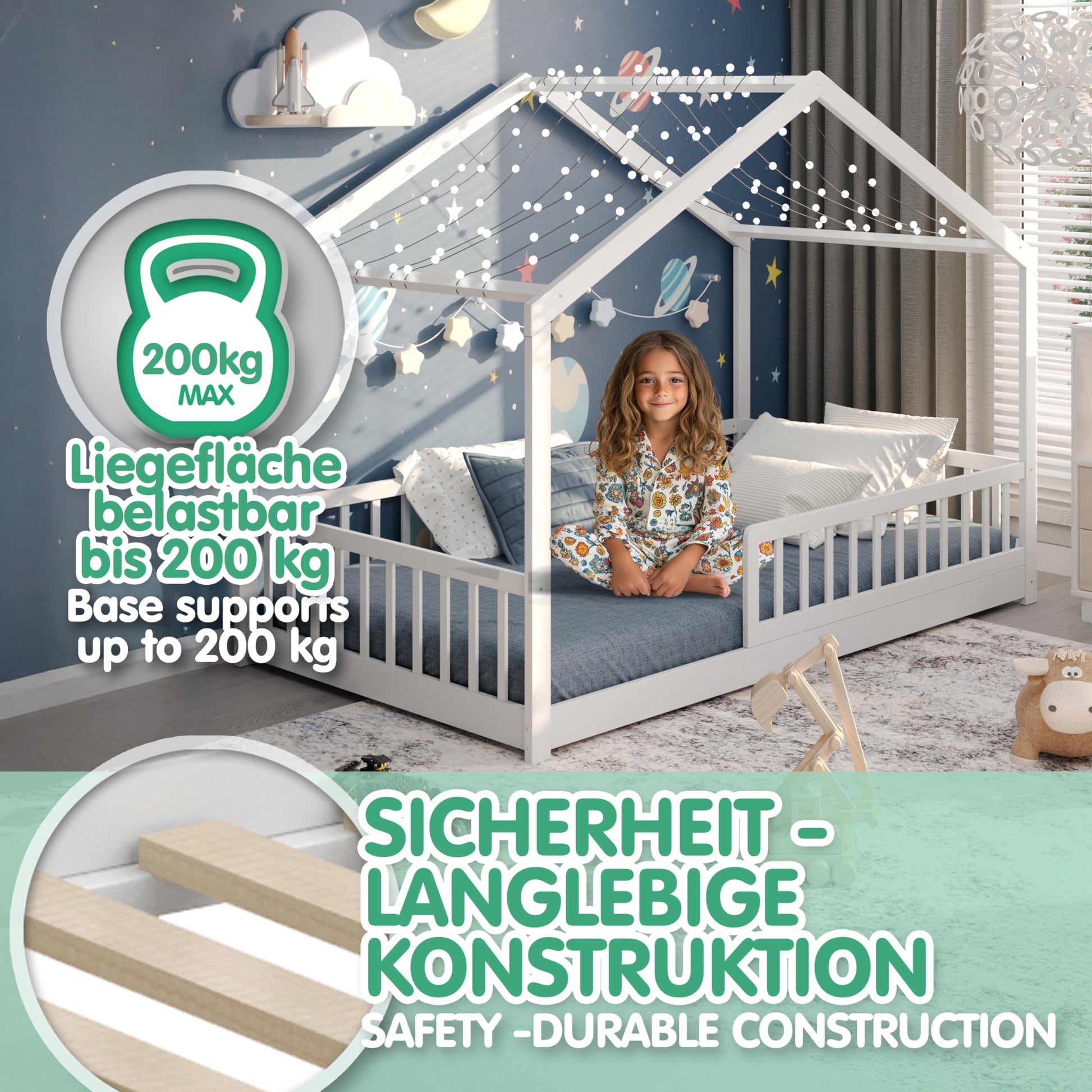 CADANI Malte Hausbett 120x200 cm Weiß, Montessori Bodenbett Rausfallschutz abnehmbar, Kinderbett Umbaubar inkl. Roll-Lattenrost, bis 200 kg belastbar