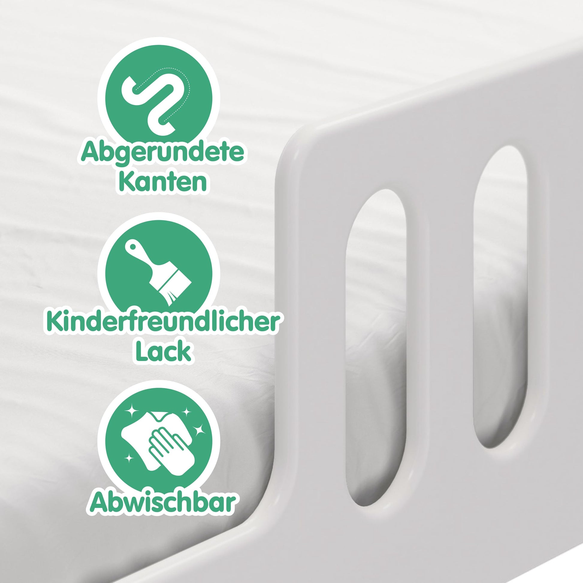- ✅ Zeitloses, Raumgestaltendes Design mit Kreativem Touch: Unser Bett überzeugt durch sein zeitloses, weißes Design und die ovalen Löcher in den Seitenteilen, die harmonisch in jedes Zimmer passen und die kindliche Phantasie anregen. Im Lieferumfang enthalten sind das Bodenbett, Rausfallschutz, ein zusätzliches Seitenteil ohne Rausfallschutz sowie ein robustes Roll-Lattenrost aus Massivholz.
