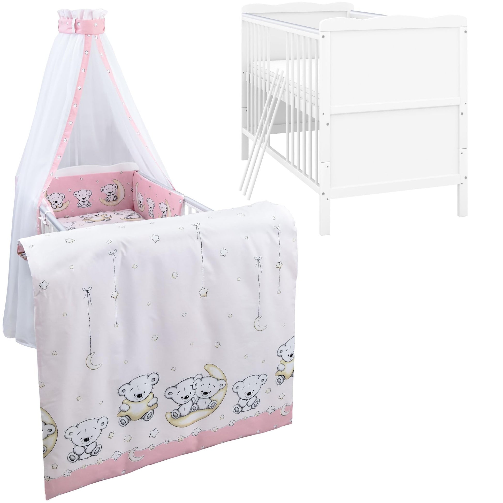 Generisch Baby Delux Babybett Komplett Set 9-TLG Kinderbett umbaubar zum Juniorbett 70x140 Matratze Jack Bettset Chiffonhimmel (Teddy Mond rosa)