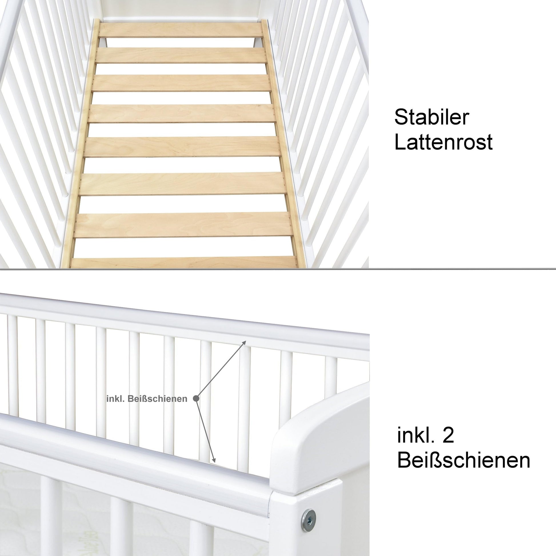 Einzelheiten: Babybett Kinderbett 70 x 140 in weiß inkl. Bettwäsche Set.