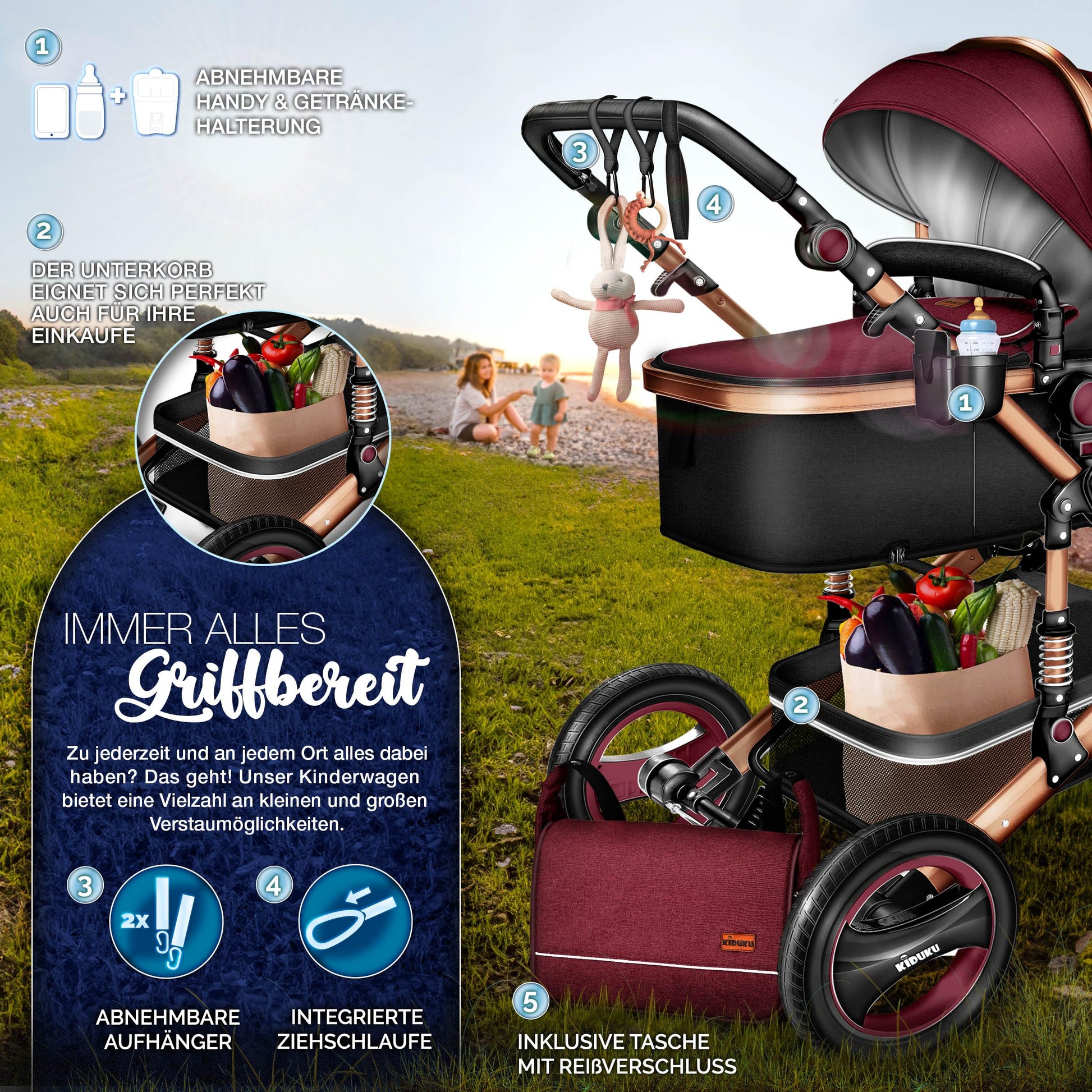 KIDUKU® 3 in 1 Kinderwagen XXL Komplettset | Kombikinderwagen Set inkl. Babywanne Buggy Sportsitz & Auto-Babyschale Fußsack | Vollgummireifen Wickeltasche Handwärmer Regenschutz Kindertisch ECE R129