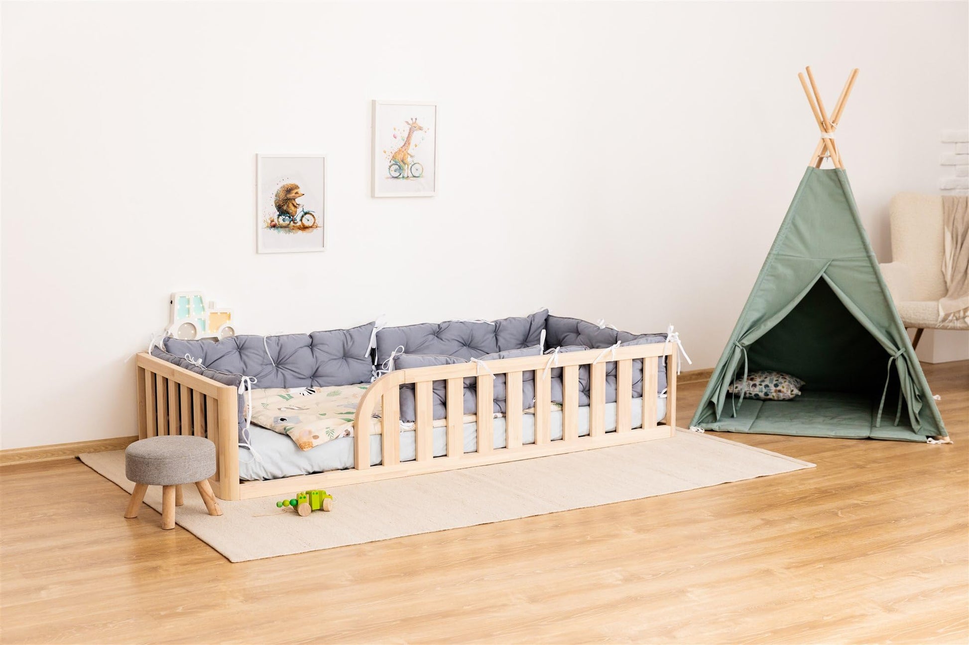 Entdecken Sie das Mandrele Montessori Kinderbett, das von der Montessori-Philosophie inspiriert ist und die Unabhängigkeit Ihres Kindes fördert. Dieses Bodenbett ermöglicht es den Kleinkindern, mühelos ein- und auszusteigen, während die integrierten Geländer für zusätzliche Sicherheit sorgen. Hergestellt aus FSC-zertifiziertem Kiefernholz, sind die Materialien kindersicher und umweltfreundlich. Mit Stolz in der EU gefertigt, bietet dieses Bett eine Kombination aus Qualität, Sicherheit und Nachhaltigkeit, ideal für die Entwicklung und Selbstständigkeit junger Kinder.