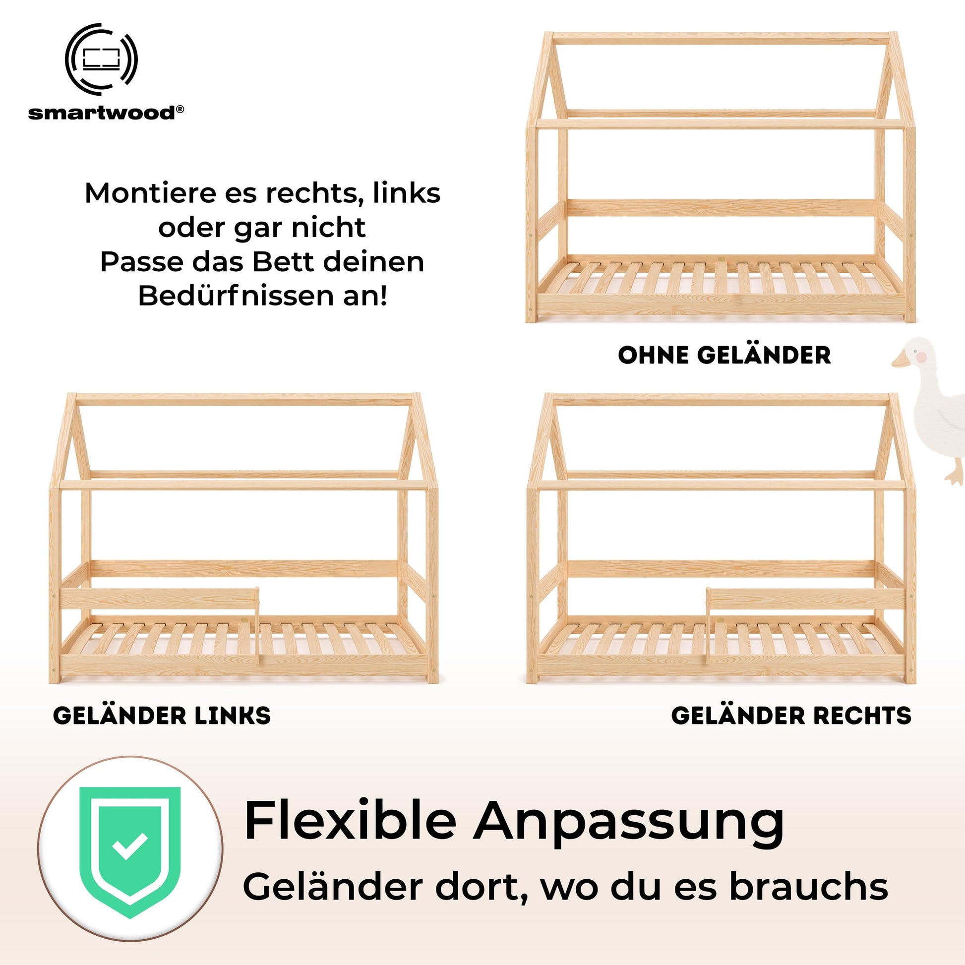 - Kinderbett mit Rausfallschutz - Hausbett mit 29,5 cm hohem Geländer, die je nach Wunsch links oder rechts vom Einstieg angebracht werden kann - oder ganz ohne Geländer für mehr Freiheit - ideal für Kinder ab 2 Jahren, die sicher und selbstständig schlafen sollen