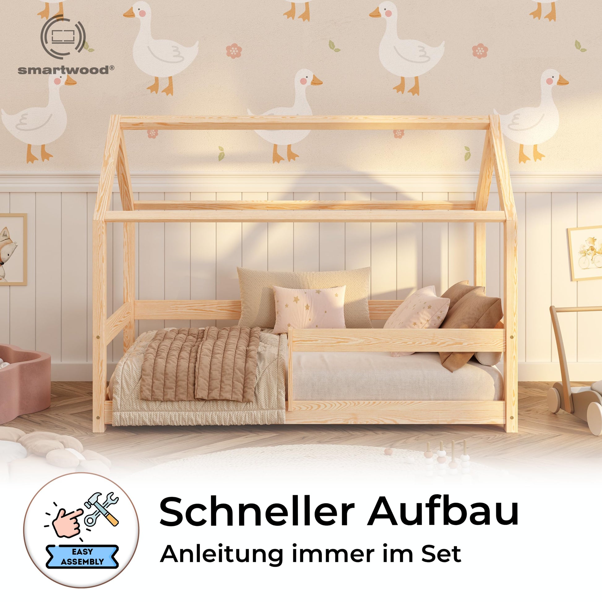 smartwood Hausbett 90x200 cm aus Massivholz - Kinderbett mit Rausfallschutz & Lattenrost bis 230 kg - Skandinavisches Design - für Jungen & Mädchen - Einfache Montage