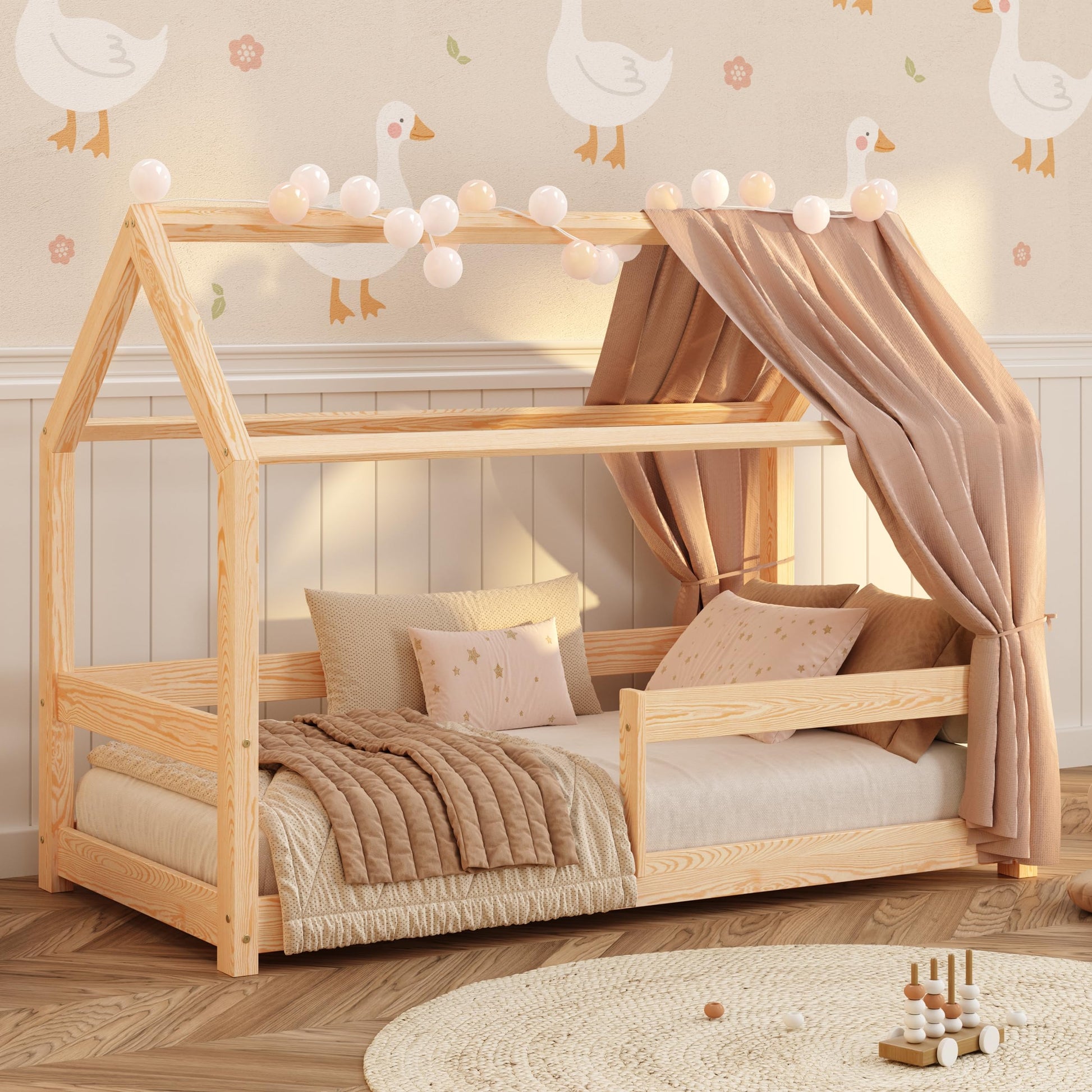 - Kinder Hausbett 90x200 aus massivem Kiefernholz - sorgfältig gebürstet und glatt geschliffen, ohne scharfe Kanten. Das Montessori Bett mit einem Einstieg von 12 cm Höhe bietet freien Zugang und unterstützt die Selbstständigkeit des Kindes beim täglichen Aufstehen und Einschlafen