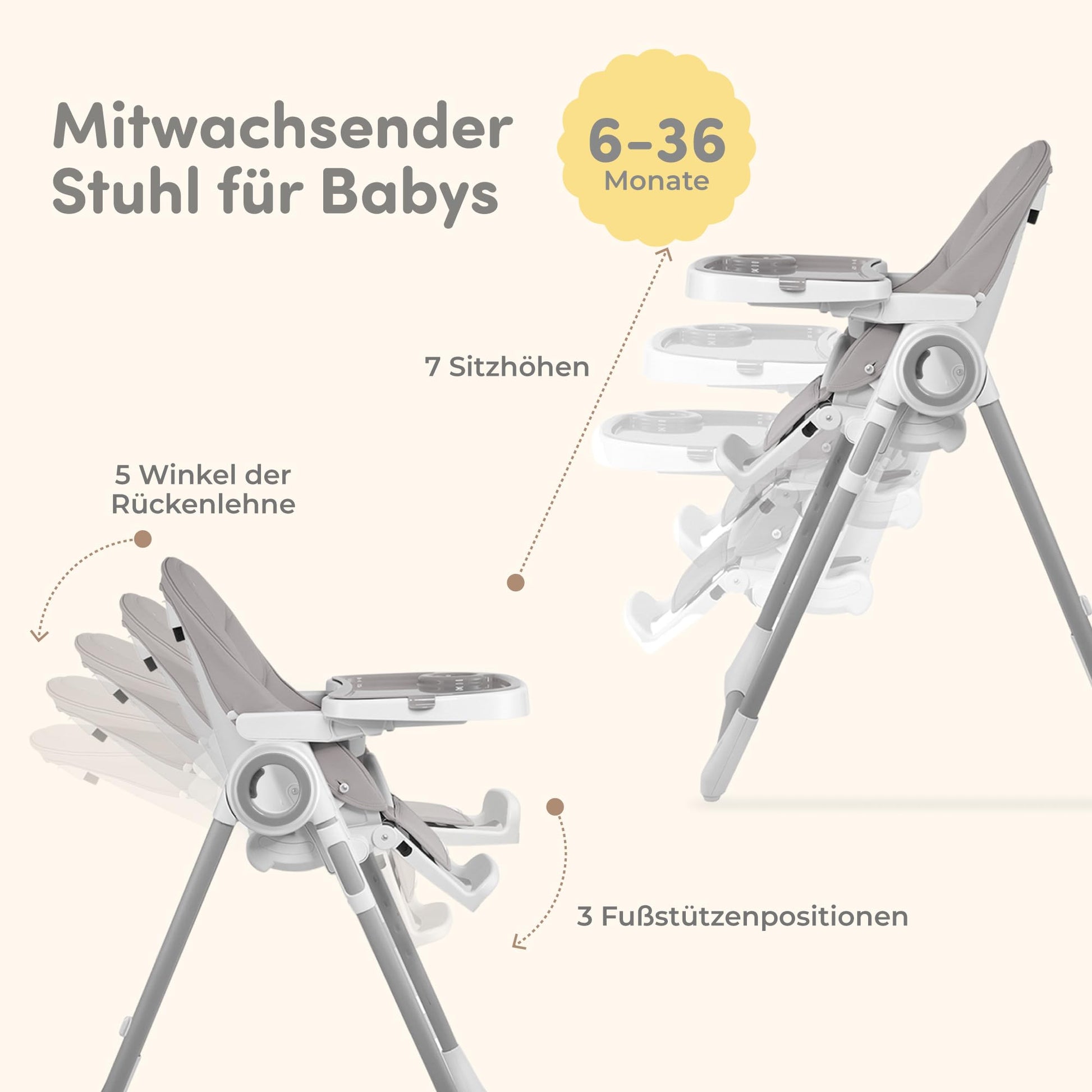 - SICHERHEIT UND QUALITÄT FÜR IHR BABY - Jeder mitwachsende Babystuhl ist gemäß EN 14988 zertifiziert und wird mit einem garantiert BPA-freiem Kunststoffteller geliefert. Durch den Einsatz von verstärkten Materialien eignet der Kinderhochstuhl mit Tisch sich für Säuglinge und Kleinkinder bis zu 15 kg. Der 5-Punkt Schrittgurt Hochstuhl sorgt dafür, dass Ihr Baby während seiner Mahlzeiten ausreichend gesichert ist: Bieten Sie ihm einen Hochsitz Baby in der Qualität, die es verdient!