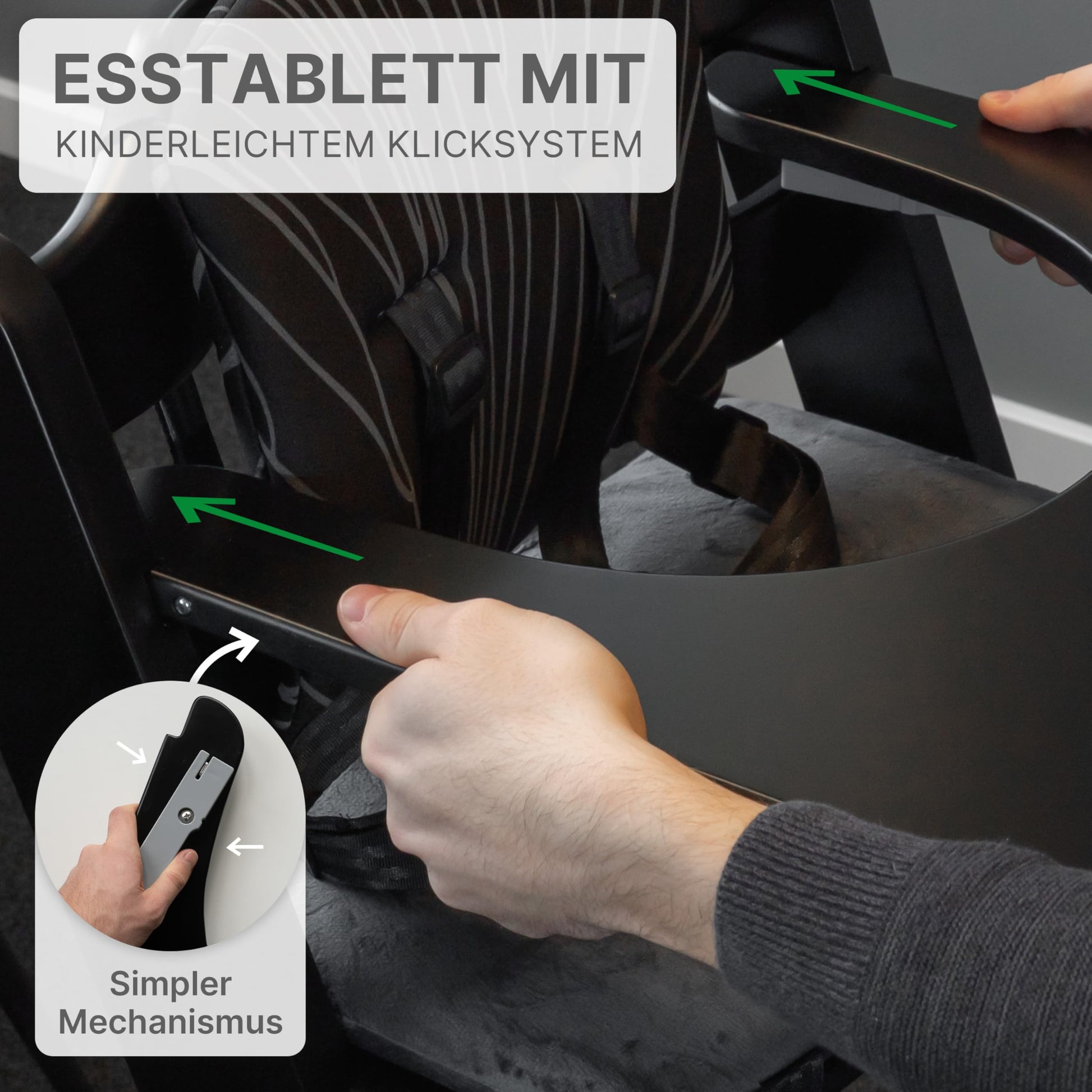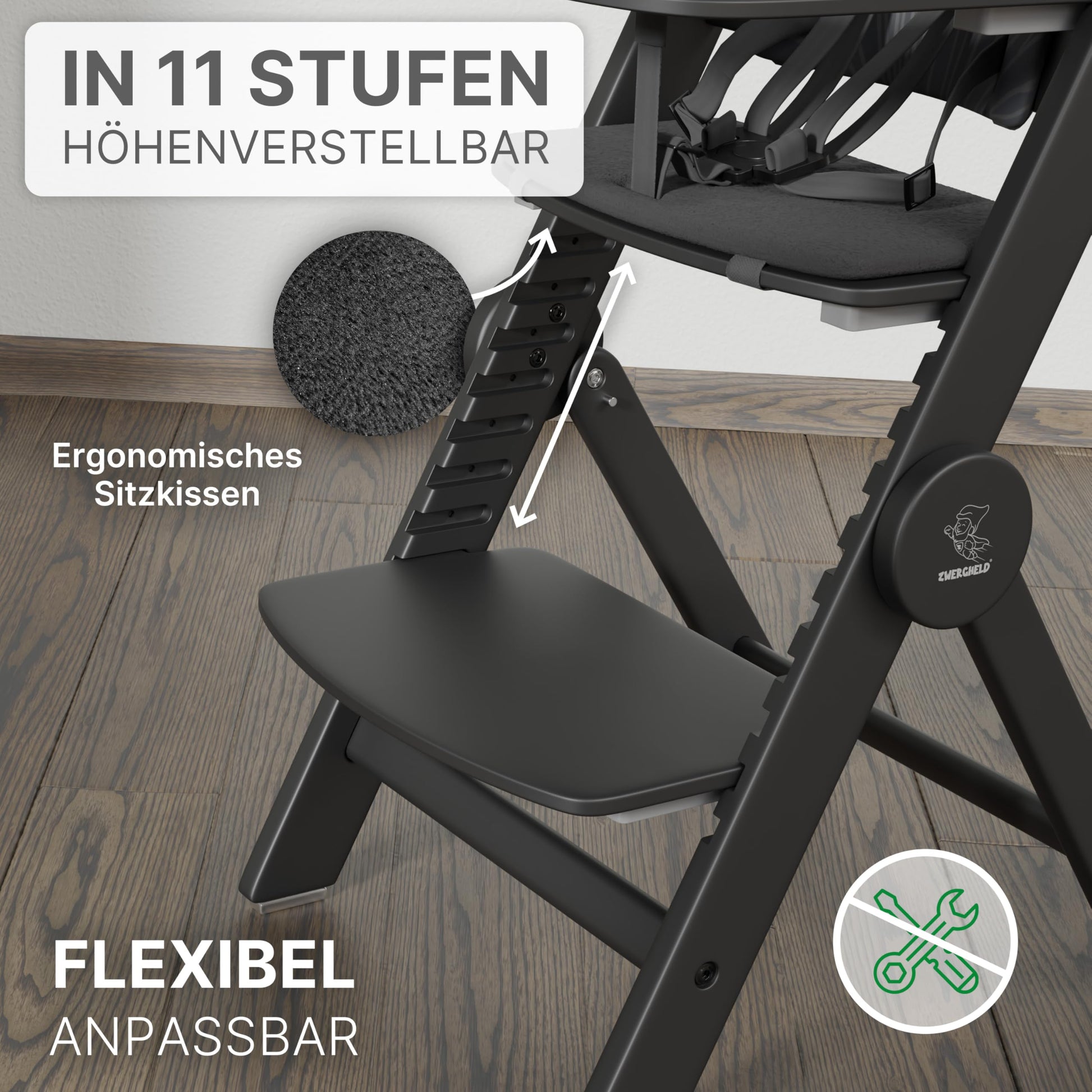 ZWERGHELD® Premium Kinderhochstuhl ZS3 Set - mitwachsend klappbar verstellbar, Hochstuhl Baby ab 6 Monaten bis 90kg belastbar, mit Essbrett - Treppenhochstuhl Kinderstuhl Holz High Chair (pearl-black)